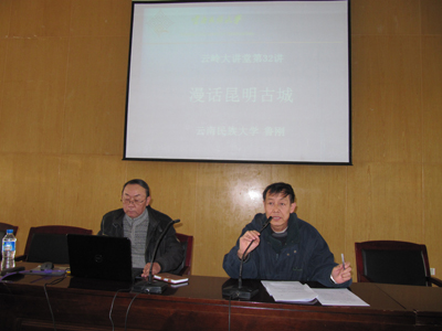 昆明科学发展研究院承办的2013年“云岭大讲坛”第4讲暨“昆明讲坛”第41讲于12月6日下午在惟行楼1501报告厅举行。此次讲座邀请了原云南民族大学人文学院院长、二级教授、中国人民大学博士研究生导师鲁刚以“漫话昆明古城”为主题进行了专题学术讲演。