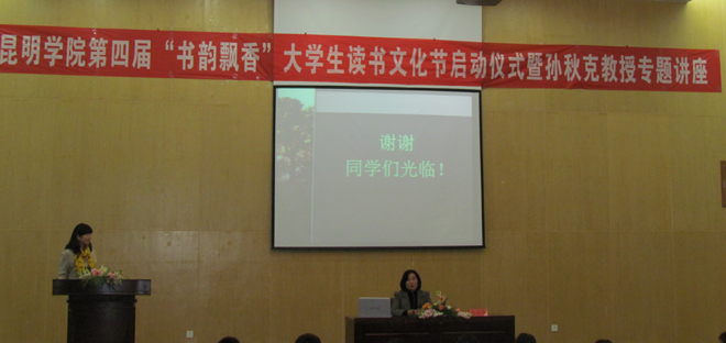 本届读书文化节启动仪式邀请到了云南省国学研究会理事、原人文学院教授孙秋克老师为德赢官网大学生做专题讲座。讲座上,孙教授围绕“e时代阅读”这一主题,结合流行与经典的书籍、如何选书、如何读书等内容,为同学们进行全面深入地分析。孙教授认为读书应聚精会神、由浅入深、由略到详、由表及里地了解文学作品思想,在心中进行再创作,还原视觉形象,最后达到废寝忘食是阅读的最高境界。最后,孙教授以 “开卷有益,只争朝夕”结束了本场讲座。启动仪式最后,团委副书记魏妮娅作总结。她对孙教授的精彩讲座表示衷心感谢,她认为读书应当作为当代大学生的一种志趣,陪伴终生。希望通过本届读书文化节的举办能激发同学们的读书热情,在同学中掀起爱书热潮,营造书韵飘香的校园氛围。